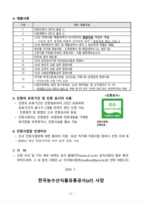 안녕하세요, aT 직거래사업부입니다. 아래와 같이 2026년 우수 농산물 직거래사업장 인증제 모집기간을 연장하오니 많은 신청 바랍니다. (기존)~2026.2.9(월)까지 (변경)~2026.2.27(금)까지