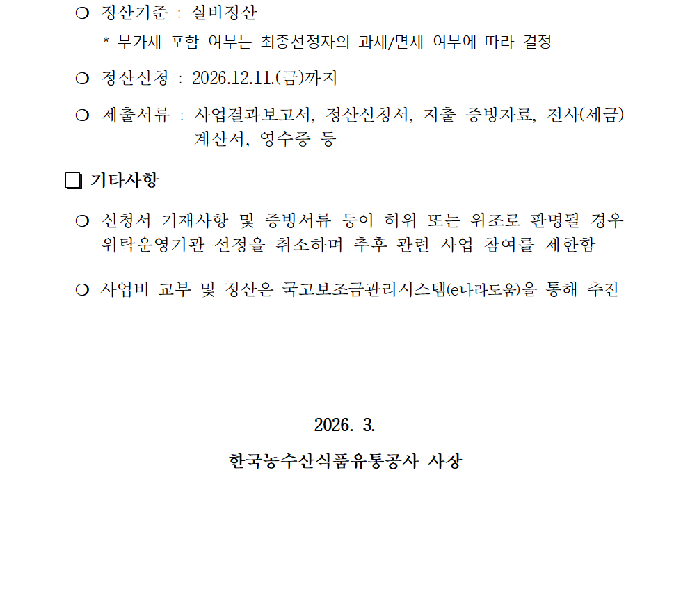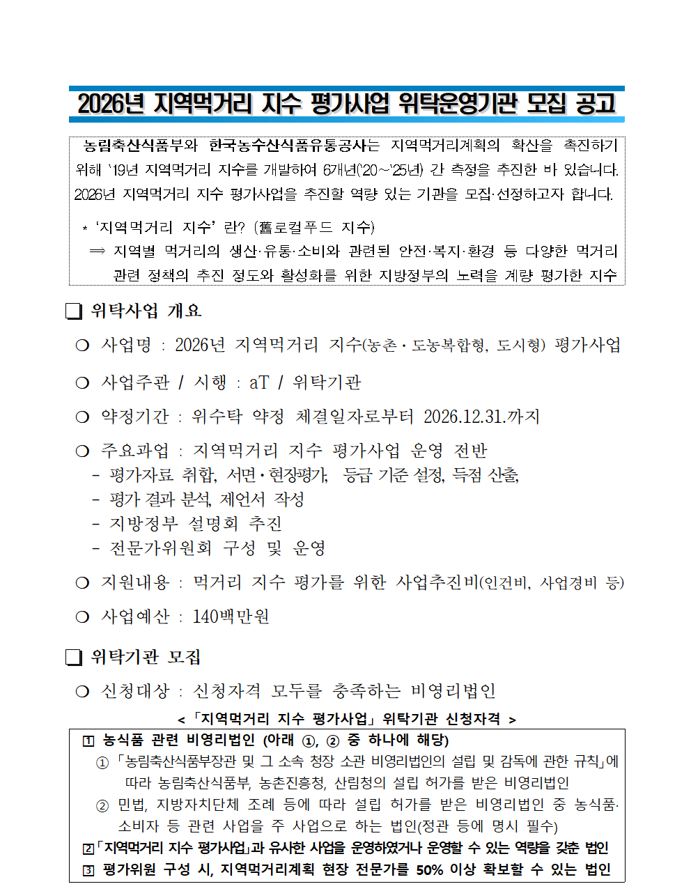 농림축산식품부와 한국농수산식품유통공사는 2026년도 지역먹거리 지수 평가사업을 추진할 역량있는 기관을 모집, 선정하고자 합니다. 자세한 사항은 붙임의 공고를 참고해 주시기 바랍니다. * 신청기한 : 2026.3.23(월) 18시까지