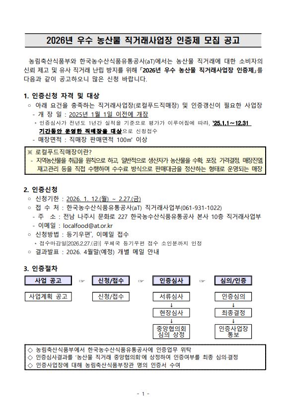 안녕하세요, aT 직거래사업부입니다. 아래와 같이 2026년 우수 농산물 직거래사업장 인증제 모집기간을 연장하오니 많은 신청 바랍니다. (기존)~2026.2.9(월)까지 (변경)~2026.2.27(금)까지